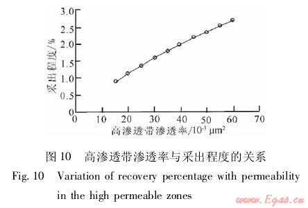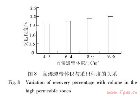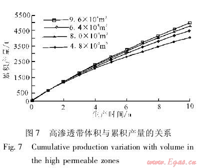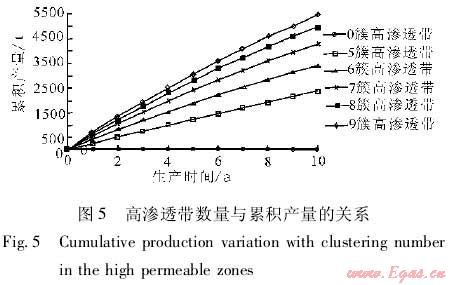 在建立的數(shù)值模型中嵌入高滲透帶,改變高滲透帶的特征參數(shù),通過(guò)數(shù)值模擬分析高滲透帶對(duì)累積產(chǎn)量和采出程度的影響。