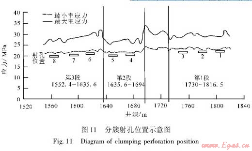 本井優(yōu)化的高滲透帶數(shù)量為8簇,因此,射孔簇?cái)?shù)為8簇。綜合選擇GR(自然伽馬)低、脆性礦物含量高、應(yīng)力值相對(duì)較低的層段進(jìn)行射孔,以有利于裂縫延伸起裂,形成縫網(wǎng)(圖11)。根據(jù)應(yīng)力測(cè)試,QY2井最小主應(yīng)力在22.1~32.4MPa之間,因此,支撐劑應(yīng)滿(mǎn)足35MPa閉合壓力要求。