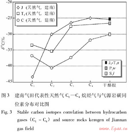 (3)本區(qū)長興組和飛仙關(guān)組天然氣的氣源巖主要為二疊系吳家坪組(P2w)烴源巖,且以Ⅱ型有機質(zhì)為主,能夠生成大量的原油,具備原油裂解作用發(fā)生的物質(zhì)基礎(chǔ)。對于本區(qū)高成熟度的天然氣而言,利用同位素資料進行氣—巖對比是比較可靠的方法。本區(qū)侏羅系和石炭系天然氣的丁烷碳同位素分別為-25.0‰和-31.9‰,而三疊系天然氣丁烷的含量低,只測得丙烷碳同位素為-27.6‰,下志留統(tǒng)龍馬溪組(S1l)、吳家坪組(P2w)和侏羅系源巖干酪根的碳同位素均值分別為-30.0‰、-27.0‰和-25.5‰(圖3)。有研究表明,具有氣源關(guān)系的烴源巖的干酪根碳同位素比天然氣丁烷的碳同位素要重1.0‰左右[15]。根據(jù)這種對應(yīng)關(guān)系,侏羅系、三疊系飛仙關(guān)組和石炭系的天然氣應(yīng)該分別來源于侏羅系、二疊系吳家坪組和志留系龍馬溪組烴源巖(圖3)。從生儲配置關(guān)系來看,飛三段與上覆侏羅系之間有較厚的隔層,其氣源也不可能來自于侏羅系烴源巖;并且飛三段天然氣的碳同位素組成明顯重于石炭系天然氣(圖3),其不可能與石炭系天然氣具有相同的氣源巖。對于本區(qū)高過成熟的二疊系烴源巖(Ro均值為2.2%)而言,其有機質(zhì)類型用常規(guī)熱解和元素組成數(shù)據(jù)很難判斷[16],比較可靠的方法是利用源巖干酪根碳同位素數(shù)據(jù)進行分析。本區(qū)二疊系吳家坪組烴源巖的干酪根碳同位素值為-26.0‰~-28.2‰,與Ⅱ型有機質(zhì)具有較好的對應(yīng)關(guān)系;志留系烴源巖的干酪根碳同位素在-27.0‰~-31.0‰,主要為Ⅰ型有機質(zhì);寒武系烴源巖的干酪根碳同位素比較分散,類型可能比較復(fù)雜(圖4)。根據(jù)上述分析,本區(qū)吳家坪組烴源巖有機質(zhì)類型主要為Ⅱ型,以生油為主。