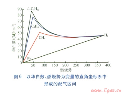 基于互換性原理進(jìn)行的試驗(yàn)氣配制,一般將甲烷、H2、N2三組分、丙(丁)烷、H2、N2三組分作為原料氣,控制試驗(yàn)氣的華白數(shù)、燃燒勢(shì)、黃焰指數(shù)等關(guān)鍵燃燒特性指數(shù)與基準(zhǔn)氣相等,并進(jìn)行以華白數(shù)、燃燒勢(shì)為主要控制指標(biāo)的配制設(shè)計(jì)[7],建立配制試驗(yàn)氣的整體分布區(qū)間。以CH4、H2、N2三組分,C3H8、H2、N2三組分,n-C4H10、H2、N2三組分,i-C4H10、H2、N2三組分為原料氣,在以華白數(shù)、燃燒勢(shì)為變量的直角坐標(biāo)系中形成的配氣區(qū)間見(jiàn)圖6。由圖6可知,各組原料氣形成的配氣區(qū)間邊界線并不全為直線,任兩種可燃?xì)怏w形成的配氣邊界線為指數(shù)曲線,而N2與H2、N2與另一種烷烴可燃?xì)怏w形成的配氣邊界線為直線。