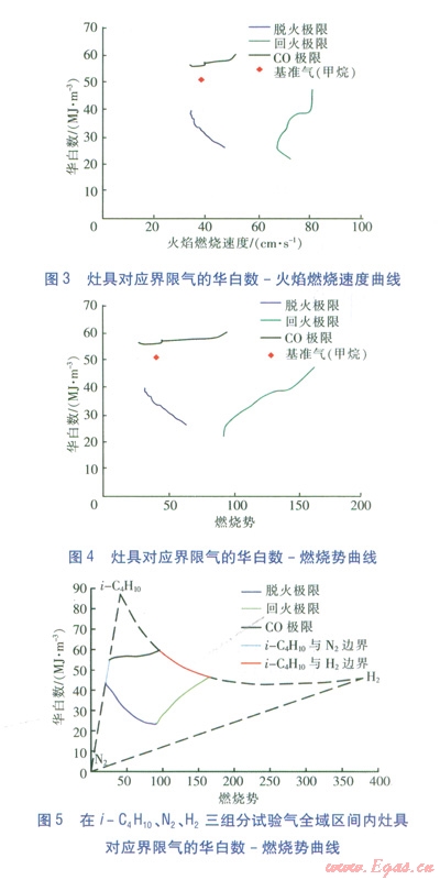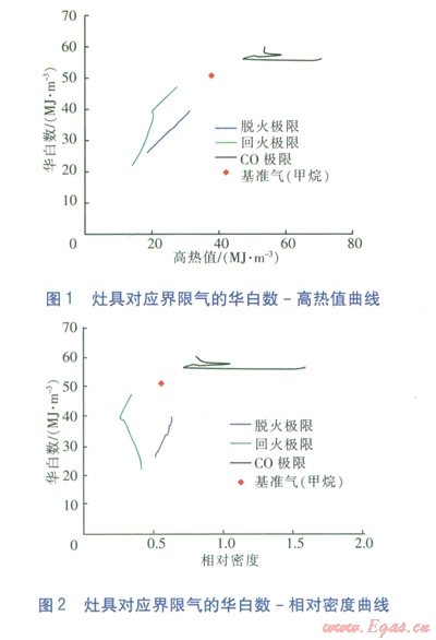 為了確定表征燃具適應(yīng)性的燃燒特性指數(shù),課題組建立了試驗(yàn)裝置,選擇大氣式燃具(主要為家用燃?xì)庠罹?,包括嵌入式灶、臺(tái)式灶),進(jìn)行了燃燒工況測(cè)試。分別測(cè)量灶具在脫火、回火、C0超標(biāo)時(shí)的燃?xì)饨M成,由此計(jì)算各極限情況下的燃燒特性指數(shù)。并根據(jù)華白數(shù)、高熱值、相對(duì)密度、火焰燃燒速度、燃燒勢(shì)等關(guān)鍵指數(shù),繪制試驗(yàn)數(shù)據(jù)圖形(直角坐標(biāo)系),確定表征燃具適應(yīng)性的燃燒特性指數(shù)。