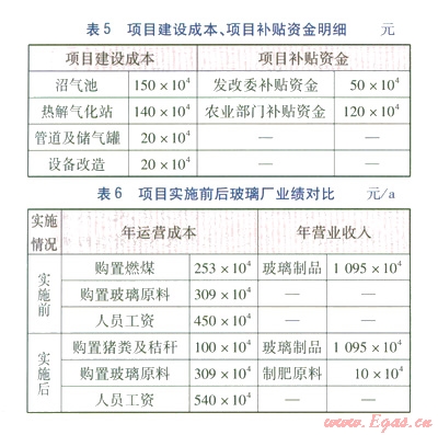 根據(jù)項(xiàng)目改造需要,在玻璃廠原有生產(chǎn)設(shè)備基礎(chǔ)上,需要修建沼氣池、熱解氣化站、儲(chǔ)氣罐等設(shè)施,應(yīng)列入建設(shè)成本。由于該項(xiàng)目符合國(guó)家政策中著力進(jìn)行綠色能源縣以及新農(nóng)村建設(shè)的思路,可得到發(fā)改委以及農(nóng)業(yè)部門的財(cái)政補(bǔ)貼。結(jié)合企業(yè)自籌資金,項(xiàng)目改造具有充分的經(jīng)濟(jì)保證。項(xiàng)目建設(shè)成本、項(xiàng)目補(bǔ)貼資金明細(xì)見表5,項(xiàng)目實(shí)施前后玻璃廠業(yè)績(jī)對(duì)比見表6。項(xiàng)目實(shí)施前的人員數(shù)量為100人,實(shí)施后新增崗位30個(gè)。