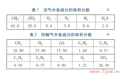沼氣、熱解氣中各組分的體積分?jǐn)?shù)見表1、2。熔化單位質(zhì)量玻璃耗熱量為2 000 MJ/t,玻璃廠每日熔化玻璃質(zhì)量約20 t/d。沼氣與熱解氣按l:1的體積比例混合,混合氣低熱值為l5 MJ/m3,燃?xì)獠AС馗G生產(chǎn)系統(tǒng)的熱效率取80%。由此可計(jì)算得每日混合氣需求量為3 333 m3/d,則沼氣與熱解氣的需求量分別為1 666.5 m3/d。經(jīng)核算,每日需處理豬糞35 t/d,需處理秸稈5.2 t/d。