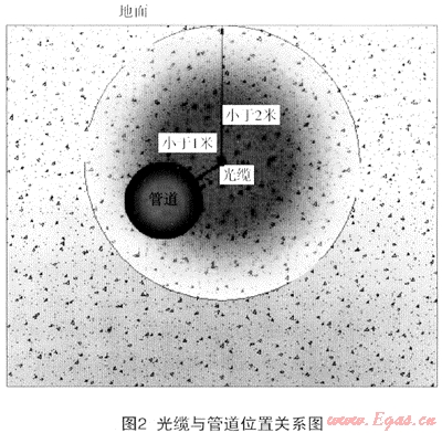 受當(dāng)前儀器設(shè)備精度所限,只能分析出光纖橫截面為中心半徑2m內(nèi)振動聲音信號。即,光纜有效監(jiān)測半徑只有2m,所以,管道必須完全處在光纜為中心2m包絡(luò)線之內(nèi),否則將有部分管體受不到有效保護(hù)(如圖2)。