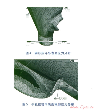 ANSYS提供了變形、應力、應變、能量等云圖顯示。錐形灰斗外表面應力分布見圖4。手孔接管內(nèi)表面根部應力分布見圖5。由圖4、5可知,最大當量應力位于手孔接管內(nèi)側(cè)的圓角過渡處,在設計壓力為0.28MPa時,最大當量應力為55.37MPa。