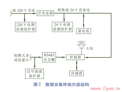 數(shù)據(jù)采集終端(DTU)是遠(yuǎn)傳抄表系統(tǒng)的重要設(shè)備之一,具有RS485/232接口,通信速率為300~115 200 bit/s,通信協(xié)議采用MODBUS RTU/ASC Ⅱ工業(yè)通信協(xié)議,內(nèi)部供電為24 V直流電。l個(gè)數(shù)據(jù)采集終端一般接1~3只燃?xì)獗?。?shù)據(jù)采集終端內(nèi)部結(jié)構(gòu)見圖2。