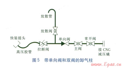 ①用CNG減壓橇來臨時(shí)供氣,或是不連續(xù)供氣(由于維修等原因可以臨時(shí)停止供氣的情況)時(shí),帶單向閥的卸氣柱工藝是較為合理的,不僅簡(jiǎn)單,也達(dá)到了較高的安全性。