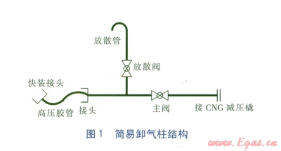 簡(jiǎn)易卸氣柱由連接CNG氣瓶車的快裝接頭、高壓膠管、主閥、放散閥、連接管道組成。簡(jiǎn)易卸氣柱結(jié)構(gòu)見圖l。