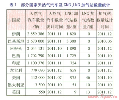 由表l可以看出,伊朗、巴基斯坦、阿根廷、巴西、印度和意大利等幾個國家的天然氣汽車擁有量接近世界天然氣汽車總量的80%,且全部采用CNG汽車。通過表l中CNG加氣站與LNG加氣站數(shù)量對比,可以判斷,世界范圍內(nèi)LNG汽車數(shù)量遠遠小于CNG汽車數(shù)量,車用LNG處于起步階段。