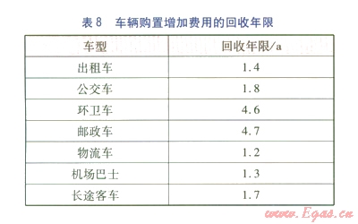 ②根據(jù)油與氣之間的差價,計算得出車輛購置增加費用的回收年限均在
