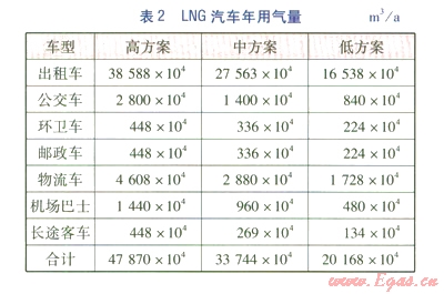 根據(jù)各類LNG車輛潛在用戶的特點,對各類LNG汽車發(fā)展數(shù)量及年用氣量進行了高、中、低3種方案的預(yù)測,分別見表1、2。