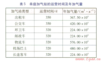 按30%資本金考慮,其余為國內(nèi)商業(yè)銀行貸款,貸款利率為7.05%。單座加氣站的運營時間及年加氣量見表5。