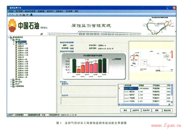 圖l為龍崗氣田試采工程腐蝕監(jiān)測系統(tǒng)功能主界面圖,通過中間數(shù)據(jù)庫實現(xiàn)與龍崗氣田數(shù)字化巡檢系統(tǒng)和三維地理信息系統(tǒng)的數(shù)據(jù)交互,實現(xiàn)腐蝕數(shù)據(jù)的圖形展示,為管理者提供決策依據(jù)。