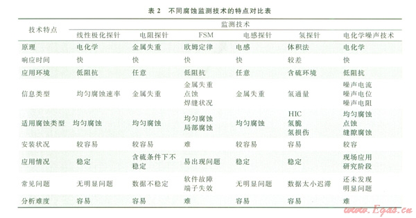 5)電阻探針、電感探針、線性極化探針、腐蝕掛片及水分析等傳統(tǒng)的腐蝕監(jiān)測方法被廣泛用于高含硫氣田。FSM、氫探針技術(shù)、電化學(xué)噪聲技術(shù)等腐蝕監(jiān)測新技術(shù)在研究點蝕、縫隙腐蝕和氫致開裂等方面具有獨(dú)特的優(yōu)勢。