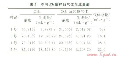 筆者在實驗室條件下模擬了不同Eh條件下生物甲烷生成的情況,對不同條件下產出的氣體及甲烷含量進行分析,并對甲烷在不同反應階段的生成方式進行了探討,實驗結果表明: