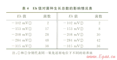 3)Eh值對菌種總量的影響。實驗結束后對反應瓶中的細菌進行接種培養(yǎng),并采用活菌計數(shù)法對菌種量進行計數(shù)得出表4。
