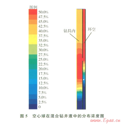 泵入的空心球與鉆井液混合流體中空心球的含量為40%,經(jīng)過分離后,大部分空心球由于密度的差異和環(huán)空流動的影響進入環(huán)空,環(huán)空分離點以上空心球體積達到50%,分離點以下僅有少量的空心球(小于2%)未實現(xiàn)有效分離。如圖5所示,空心球在注入點以上環(huán)空內(nèi)分布均勻,能夠有效降低環(huán)空分離點以上鉆井液的密度,實現(xiàn)多梯度鉆井技術(shù)。