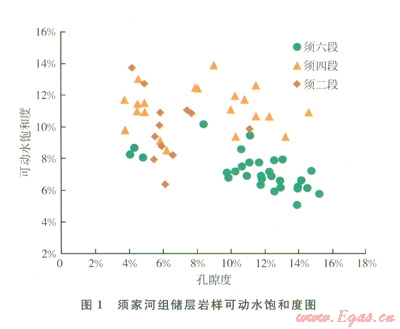 1)廣安須六段儲(chǔ)層可動(dòng)水飽和度最低,須四段儲(chǔ)層可動(dòng)水飽和度最高,須二段儲(chǔ)層可動(dòng)水飽和度介于兩者之間。