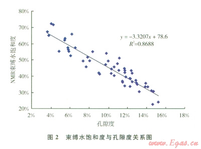常規(guī)測(cè)井解釋可動(dòng)水飽和度的原理如下:①根據(jù)核磁共振技術(shù)標(biāo)定巖樣束縛水飽和度(原始含水飽和度減去可動(dòng)水飽和度)與孔隙度之間的關(guān)系(圖2);②在各個(gè)深度點(diǎn),根據(jù)常規(guī)測(cè)井解釋出的孔隙度計(jì)算出束縛水飽和度;③將常規(guī)測(cè)井解釋出的原始含水飽和度減去束縛水飽和度,得到該深度儲(chǔ)層的可動(dòng)水飽和度,從而繪制出可動(dòng)水飽和度縱向分布曲線。