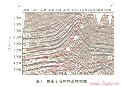 圖2顯示了獨(dú)山子北斷裂沿白堊系吐谷魯群泥巖層滑脫,向上突破進(jìn)入古近系地層,控制了獨(dú)山子背斜斷層傳播褶皺的發(fā)育。獨(dú)山子背斜中淺層為典型的斷層傳播褶皺。其特點(diǎn)為:①背斜后翼模擬下盤(pán)斷坡產(chǎn)狀;②形成向斷層運(yùn)動(dòng)方向傾倒的不對(duì)稱背斜;③常有突破斷層發(fā)育;④突破斷層位移量很小[4]。
