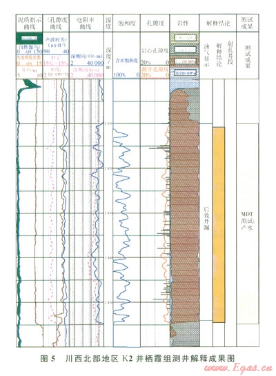 當(dāng)儲(chǔ)層內(nèi)的流體為低礦化度的地層水或淡水時(shí),由于水中呵移動(dòng)的導(dǎo)電離子數(shù)大量減少,從而導(dǎo)致電阻率值增加,在測(cè)井電阻率曲線上則表現(xiàn)出高電阻率特征。由于隨著勘探程度的不斷提高,勘探家們?cè)絹?lái)越認(rèn)識(shí)到淡水地層的電阻率類(lèi)同氣層,電阻率值較高,因而按常規(guī)解釋易出偏差,這也是HS1井柄霞組水層呈現(xiàn)出高電阻率特征易解釋失誤的原因。K2井棲霞組巖性主要為淺灰-灰色細(xì)-中晶白云巖,粗晶(砂糖狀)白云巖發(fā)育。巖心分析物性表明,孔隙度分布范圍介于0.42%~l 6.61%,孔隙度在各個(gè)區(qū)間分布較為平均,平均孔隙度為3.03%,明顯較HS1井高(圖2),儲(chǔ)層物性特征明顯較致密的HS1井好,屬于中等-好儲(chǔ)層。從K2井儲(chǔ)層測(cè)井解釋看,棲霞組儲(chǔ)層電性特征具有低伽馬值、高電阻率、相對(duì)較高的聲波時(shí)差特征,無(wú)疑具有典型的氣層特征(圖5)。但通過(guò)該井MDT取樣分析卻表明:儲(chǔ)層段產(chǎn)水。根據(jù)本井MDT水樣分析資料,其Cl-含量?jī)H164 mg/L礦化度低,反映儲(chǔ)層中的水為淡水特征。