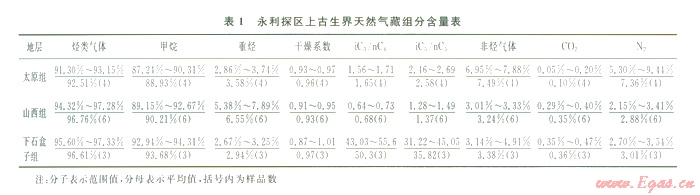 1)永利探區(qū)上古生界氣藏天然氣組分以烴類氣體為主,甲烷為烴類氣體的主要組分,其含量多超過90%,非烴氣體以氮?dú)鉃橹?,極少量為二氧化碳;氣藏的重?zé)N含量不高,干燥系數(shù)較高,氣藏總體上偏干,下石盒子組天然氣曾經(jīng)經(jīng)歷過較明顯的分餾作用。