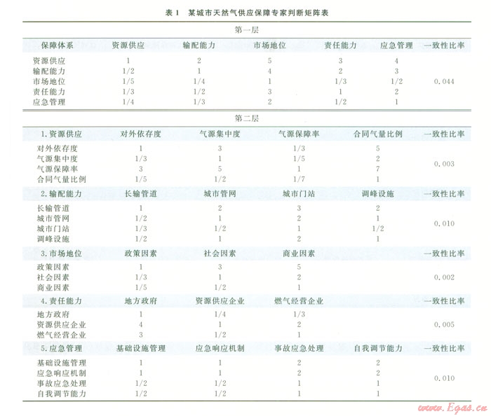 摘要 天然氣作為清潔能源在城市能源消費結(jié)構(gòu)中所占比例越來越高,供氣安全關(guān)系到千家萬戶和國計民生,建立供氣保障指標體系和數(shù)學(xué)模型對認識供氣影響因素,提升保障措施具有重要意義。為此,從資源供應(yīng)、輸配能力、市場地位、責(zé)任能力和應(yīng)急管理五大方面,構(gòu)建了含有l8個評價指標的城市天然氣供應(yīng)保障指標體系,并根據(jù)行業(yè)特點給出了各指標體系的定義,以評價城市能否得到足量、及時的天然氣供應(yīng)。將保障指標體系應(yīng)用于國內(nèi)某城市,選擇層次分析法計算各項指標權(quán)重,定性與定量相結(jié)合分析可知影響其供氣安全的主要制約因素,進一步可得到提高該城市供氣保障安全的方向和措施。所建模型在分析影響城市供氣安全不利因素,增強城市供氣保障措施和安全系數(shù)上,具有一定的輔助作用。