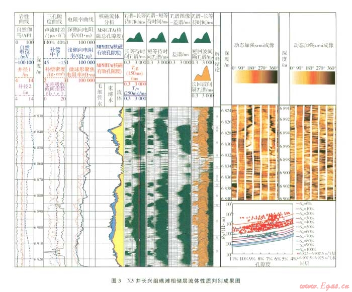 2)不同飽和度下電阻率與孔隙度交會、核磁共振測井氣水弛豫分布信息足礁灘相儲層氣水差異判別的最有效的方法。尤其能解決裂縫引起的深淺側(cè)向負(fù)差異的流體性質(zhì)識別難題。