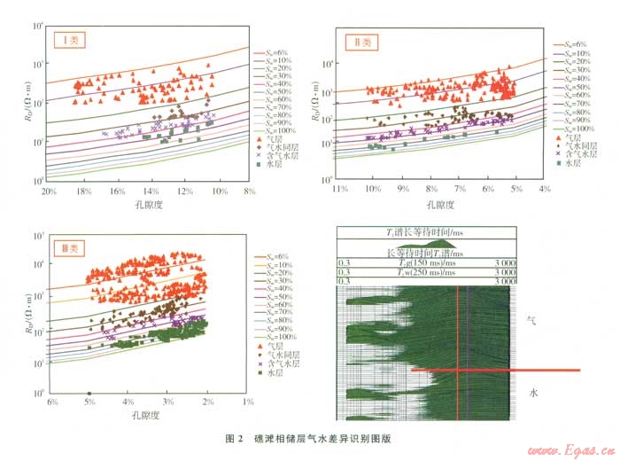 常規(guī)和核磁共振測井結(jié)合是判別礁灘相儲層流體性質(zhì)的最有效的方法。礁灘相儲層非均質(zhì)性強(qiáng),不同儲層物性對應(yīng)的孔隙度膠結(jié)指數(shù)、飽和度指數(shù)有所差異,與此對應(yīng)的氣水差異識別圖版也有所不同。因此,針對這些特征,以φ≥10%、φ=5%~l0%、φ=2%~5%作為礁灘相儲層Ⅰ、Ⅱ、Ⅲ類的物性分類標(biāo)準(zhǔn),分別擬合了Ⅰ、Ⅱ、Ⅲ類儲層在不同飽和度下電阻率與孔隙度的氣水識別圖版(圖2),這些圖版是基于密閉取心分析的不同儲層物性的孔隙度膠結(jié)指數(shù)、飽和度指數(shù)的差異而建立的,其樣本點(diǎn)主要是YB地區(qū)長興組礁灘相儲層已經(jīng)測試的電測數(shù)據(jù)。因此,依據(jù)Ⅰ、Ⅱ、Ⅲ類儲層氣水識別圖版,能準(zhǔn)確判別出礁灘相儲層的流體性質(zhì)。