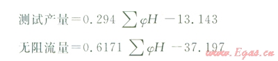 川東北YB地區(qū)長興組礁灘相儲層儲集空間主要以溶蝕孔洞型儲層為主,因此孔隙度對產(chǎn)能的控制起到關(guān)鍵作用,特別是φ介于5%~l0%的Ⅱ類儲層和φ≥10%的Ⅰ類儲層對產(chǎn)能的貢獻(xiàn)起主導(dǎo)作用。除孔隙度以外,儲層厚度也是控制產(chǎn)能的關(guān)鍵因素,由于元壩長興組氣層的含氣飽和度整體較高,不同物性的氣層飽和度差異較小?;谏鲜龇治稣J(rèn)為氣層孔隙度和有效厚度(限于Vsh≤l0%、φ≥2%、Sw≤20%)的乘積累加能直接反映出儲層的產(chǎn)能狀況,依據(jù)此,選取測試資料較為豐富的礁灘相氣層建立產(chǎn)能預(yù)測模型,為礁灘相儲層快速便捷地進(jìn)行產(chǎn)能預(yù)測提供技術(shù)依據(jù)。表2為川東北YB地區(qū)礁灘相儲層參數(shù)及測試情況表,圖4-a為∑φH與測試產(chǎn)能之間的關(guān)系,圖4-b為∑φH與無阻流量之間的關(guān)系,從圖4中看出∑φH與兩者相關(guān)性較好,相關(guān)系數(shù)分別達(dá)到0.849和0.852。因此,認(rèn)為YB地區(qū)長興組礁灘相儲層產(chǎn)能預(yù)測可采用如下模型:
