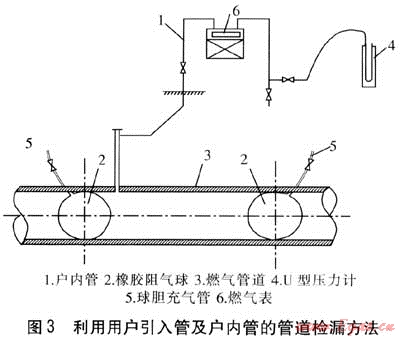 如果兩球之間的管段上連接有用戶,則可利用用戶引入管進(jìn)行管道檢漏(見圖3),充氣和測(cè)壓可充分利用用戶引入管及戶內(nèi)管。
