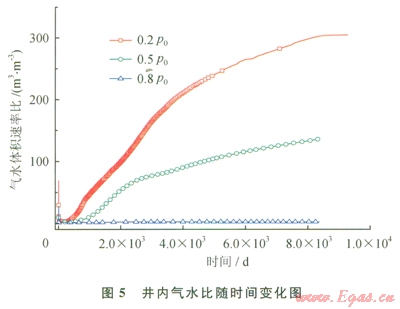 從上述研究成果町以得出,在0.2p0條件下,水合物藏中水合物全部分解,井內(nèi)收集到3.4×105m3的氣體。圖4為0.2p0、42℃,0.5p0、42℃,0.8p0、42℃這3種條件下,井內(nèi)收集水的累積變化圖。從圖4中可以看出,產(chǎn)水集中在開(kāi)采前期1500d,后期產(chǎn)水速率小。在0.5p0、42℃,0.8p0、42℃條件下,也有較大量的水被收集,表明也有較大量的水合物被分解了。圖5為整個(gè)開(kāi)采過(guò)程中3種條件下,井內(nèi)氣水比隨時(shí)間的變化圖。從圖5可以看出,0.2p0、42℃條件下,氣水比一直在增加,最大值達(dá)到304;而0.5p0、42℃條件下,氣水比增加緩慢,最大達(dá)到136;0.8p0、42℃條件下氣水體積比一直接近0,開(kāi)采后期也沒(méi)有改善。可以看出,在井內(nèi)壓力高時(shí),井和物藏間的壓差不夠大,整個(gè)開(kāi)采過(guò)程,分解后的自由氣并沒(méi)有大量流人開(kāi)采井內(nèi)??梢?jiàn)減壓驅(qū)動(dòng)力對(duì)于分解后自由氣在井內(nèi)的收集非常重要。物藏和井之間壓差太小,自由氣一直留在物藏內(nèi),無(wú)法在井內(nèi)被收集。