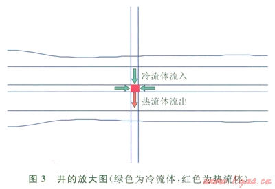 式中A1表示導(dǎo)熱面積0.4m2(井左右網(wǎng)格對(duì)井導(dǎo)熱距離大,其導(dǎo)熱熱流忽略);l表示導(dǎo)熱系數(shù),其中lrock表示地層骨架(沙石)導(dǎo)熱系數(shù),3.1W/(m·K),占0.6的空間,有效導(dǎo)熱系數(shù)為1.86W/(m·K),lrock表示水的導(dǎo)熱系數(shù)0.58W/(m·K),孔隙度為0.4,飽和度為0.5,有效導(dǎo)熱系數(shù)為0.12W/(m·K);DT表示井和其周?chē)W(wǎng)格間溫差,來(lái)自模擬結(jié)果文件;L表示導(dǎo)熱距離0.35m,井中心到上下網(wǎng)格中心距離。