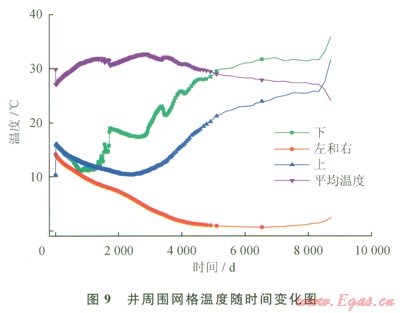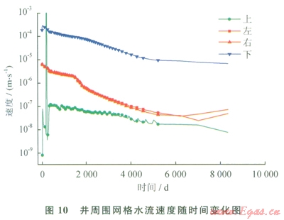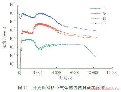 孔隙滲透換熱能夠?qū)⒛芰總魅宋锊亍Dl0為井周?chē)W(wǎng)格水流速度隨時(shí)間的變化圖。左、右和下表示網(wǎng)格中水流向井內(nèi),而上則表示井從上流入其正下方網(wǎng)格。圖10中下表示正上方網(wǎng)格流人下方井內(nèi)水流速率,也就是圖10中“下”表示的曲線,該速率遠(yuǎn)高于其他3個(gè)方向的速率。圖ll為井周?chē)W(wǎng)格中氣體速率隨時(shí)間變化圖。同樣是上方網(wǎng)格流向正下方井內(nèi)氣體速率最大,也就是圖ll中“下”表示的曲線。氣流和水流的速率數(shù)量級(jí)均為l04m/s。由于甲烷氣導(dǎo)熱系數(shù)約為0.03W/(m·K),遠(yuǎn)低于液態(tài)水的導(dǎo)熱系數(shù),其換熱可以不計(jì)算,這里只計(jì)算水的對(duì)流。