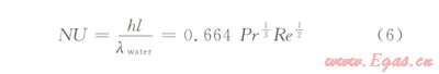 式中NU表示努賽爾數(shù);h表示換熱系數(shù);l表示特征長(zhǎng)度0.33m,4倍面積除以潤(rùn)周得到特征長(zhǎng)度;lwater表示水的有效導(dǎo)熱系數(shù),0.12W/(m·K);Pr表示普朗特?cái)?shù),取飽和水40℃時(shí)的值;Re表示雷洛數(shù)。