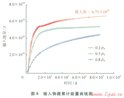 用80m×400m×1m水合物藏開(kāi)采模擬所得數(shù)據(jù),結(jié)合開(kāi)采物藏和井的參數(shù),可計(jì)算減壓和加熱對(duì)水合物分解的貢獻(xiàn)。水合物藏中水合物總質(zhì)量為3.6×106kg。由式(2)可得,完全通過(guò)加熱熔化需要能量1.27×1012J。圖7為井流向物藏的熱流隨時(shí)間變化圖。對(duì)圖7熱流進(jìn)行積分,得到輸入物藏累計(jì)能量變化曲線(圖8)。在0.2P0、42℃條件下,輸人物藏的能量最大,為6.71×1010J。井內(nèi)溫壓條件為0.5P0、42℃時(shí),輸入物藏的能量為5.39×1010J,0.8P0、42℃時(shí),輸人物藏能量為4.39×1010J。由式(1)可得,在0.2P、42℃條件下,加熱分解了5.28%的水合物,其余的水合物由減壓驅(qū)動(dòng)力所分解。而在另外兩種井內(nèi)溫度壓力條件下,加熱分解的水合物量多一些,而減壓所分解的水合物量相比更少一些。