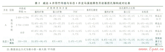 3)黑色頁(yè)巖段孔隙度較小的原因主要表現(xiàn)為兩方面:①該頁(yè)巖熱成熟度過(guò)高,有機(jī)質(zhì)叮能出現(xiàn)碳化,導(dǎo)致有機(jī)質(zhì)孔隙出現(xiàn)部分塌陷和充填;②該頁(yè)巖成巖作用強(qiáng),導(dǎo)致大孔隙減少,巖石更加致密。