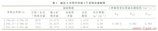 筆者在威遠(yuǎn)A井2796.60~2796.72 m、2788.17~2788.32m和2707.59~2707.68m挑選3個(gè)黑色頁(yè)巖樣品(對(duì)應(yīng)的TOC分別為3.08%、l.73%、1.23%),對(duì)孔隙度數(shù)學(xué)模型進(jìn)行刻度(表1)。首先,根據(jù)3個(gè)深度點(diǎn)的巖礦、TOC和孔隙度等測(cè)試資料和孔隙度計(jì)算模型建立三元一次方程組,然后解方程組計(jì)算獲得VBri、VClay、VTOC這3個(gè)關(guān)鍵參數(shù)值。經(jīng)過(guò)計(jì)算,筇竹寺組黑色頁(yè)巖VBri、VClay、VTOC值分別為0.O002m3/t、0.022m3/t、0.069m3/t(表1)。這表明,筇竹寺組頁(yè)巖3種物質(zhì)單位質(zhì)量所產(chǎn)生的孔隙體積為有機(jī)質(zhì)最大、黏土礦物次之、脆性礦物最小。