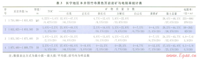 筆者依據(jù)長(zhǎng)寧地區(qū)B井筇竹寺組黑色頁(yè)巖的巖礦、地化和測(cè)井響應(yīng)資料,建立了中下部4段合計(jì)厚度159m頁(yè)巖的電阻率與TOC、黏土礦物的關(guān)系圖表(圖4、表3),以了解哪種物質(zhì)是控制頁(yè)巖導(dǎo)電性的主要介質(zhì)。此項(xiàng)研究的結(jié)果顯示,筇竹寺組黑色頁(yè)巖電阻率與黏土礦物含量無(wú)明顯相關(guān)性,但與TOC呈良好的負(fù)相關(guān)性,具體描述如下:①1730.88~1831.825m井段,厚度l01m,黏土礦物含量為28.4%~48.1%,TOC不足l%(平均0.42%),有機(jī)質(zhì)總體較少,頁(yè)巖電阻率值一般為220~686W·m,顯然是黏土礦物的導(dǎo)電性在發(fā)揮主導(dǎo)作用,并且呈現(xiàn)高阻特征;②l831.825~1851.565m井段,厚度20m,黏土礦物含量保持穩(wěn)定(29.2%~44.5%),而有機(jī)質(zhì)含量開(kāi)始增加,TOC一般介于1.0%~2.2%(平均為1.3%),頁(yè)巖電阻率則下降至18~202W·m(多為l0~100W·m),頁(yè)巖電性出現(xiàn)由高阻向低阻過(guò)渡特征,這表明有機(jī)質(zhì)導(dǎo)電性開(kāi)始顯現(xiàn),其電阻率較黏土礦物低;③1851.565~1871.46m,厚度20m,黏土含量略有下降(一般為24.2%~43.7%),有機(jī)質(zhì)含量增至l.9%~3.3%,頁(yè)巖電阻率則快速下降至0.9~7.6W·m,表現(xiàn)為明顯的低阻特征,這說(shuō)明有機(jī)質(zhì)具有較低電阻率,并且開(kāi)始主導(dǎo)頁(yè)巖地層的導(dǎo)電性;④l871.46~1889.77m,厚度18m,黏土礦物含量下降至l8%~40%(平均為25.1%),有機(jī)質(zhì)含量增加至2.2%~7.1%(平均為4.3%),頁(yè)巖電阻率則下降至0.1~1W·m,大大低于龍馬溪組頁(yè)巖和渤海灣地區(qū)低阻砂泥巖的電阻率,呈現(xiàn)超低電阻特征,這進(jìn)一步證實(shí)筇竹寺組頁(yè)巖有機(jī)質(zhì)具有較強(qiáng)的導(dǎo)電性(圖4、表3)。由此推測(cè),川南筇竹寺組頁(yè)巖中的有機(jī)質(zhì)可能出現(xiàn)了明顯的碳化現(xiàn)象,因而具有比黏土礦物更強(qiáng)的導(dǎo)電性,進(jìn)而導(dǎo)致富有機(jī)質(zhì)頁(yè)巖段(TOC>2%)具有低一超低電阻特征。