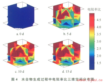 對(duì)比圖4a與圖4b發(fā)現(xiàn)電阻率變化量較大,而對(duì)比圖4c與圖4d發(fā)現(xiàn)電阻率變化較小。但是圖3中的壓力在整個(gè)水合物生成過程中是均勻下降的,表明水合物生成速率較穩(wěn)定,并沒有明顯的減慢趨勢(shì)。所以可以認(rèn)為,電阻率與水合物飽和度并不是呈完全的線性關(guān)系。當(dāng)水合物的飽和度升高到一定程度時(shí),電阻率變化減緩。這是由于當(dāng)多孔介質(zhì)中生成一定飽和度的水合物時(shí),水合物會(huì)將多孔介質(zhì)中的通道阻塞,引起電阻率迅速上升;但當(dāng)飽和度繼續(xù)上升時(shí),電阻率則變化不大。
