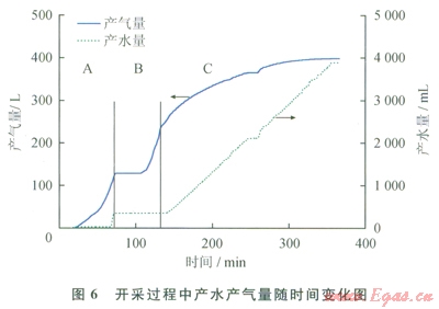 圖6為開采過程中產(chǎn)水、產(chǎn)氣量隨時(shí)間變化圖。如圖6所示,水合物開采過程一共歷時(shí)366min。3個(gè)開采階段的特性分別如下:自由氣釋放階段A中,逐漸產(chǎn)氣約ll5L,并在產(chǎn)氣即將結(jié)束的時(shí)候開始產(chǎn)水,共產(chǎn)水約400mL,此階段中的產(chǎn)氣和產(chǎn)水都是原先貯存于水合物藏中的自由氣和自由水;降壓開采階段B中,首先靜置了約30min后,再進(jìn)行降壓分解實(shí)驗(yàn),在降壓過程中共產(chǎn)氣約120L,但是沒有更多的水產(chǎn)出;注熱開采階段C中,共產(chǎn)氣約l50L,產(chǎn)氣速率隨著開采過程的進(jìn)行而降低,最終降低至0。這是由于水合物藏中的水合物逐漸分解完,水合物分解量減小從而導(dǎo)致產(chǎn)氣速率降低。并且在整個(gè)水合物注熱開采過程中,產(chǎn)水速率基本保持不變(約為20mL/min),基本與注水速率保持一致。