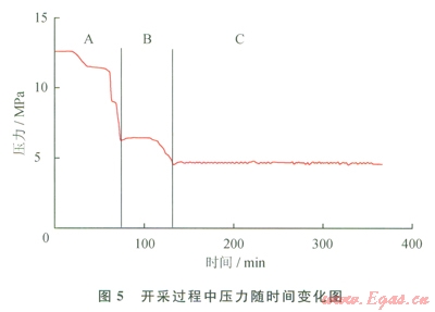 圖5為開采過程中系統(tǒng)壓力隨時(shí)間變化圖。如圖5所示,根據(jù)壓力的變化可以把整個(gè)開采階段分為3個(gè)階段,分別為階段A、階段B和階段C。其中,在階段A中,壓力由生成結(jié)束時(shí)的12MPa降低至6.5MPa,而6.5MPa高于此時(shí)水合物藏溫度8℃所對(duì)應(yīng)的相平衡壓力(5.6MPa),也就是說在階段A中水合物并不分解,所以此階段被稱為自由氣釋放階段。在階段8中,壓力由6.5MPa降低至4.7MPa,在此階段中,由于系統(tǒng)壓力低于相平衡壓力導(dǎo)致水合物開始分解,所以此階段被稱為降壓開采階段。在階段C中,壓力穩(wěn)定在4.7 MPa附近幾乎不變,并且開始通過水平井C注熱開采水合物,所以此階段被稱為注熱開采階段。