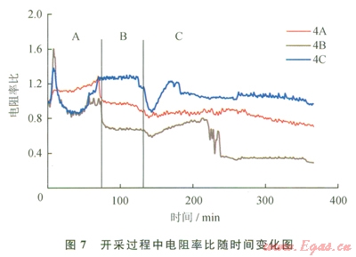 下面研究一下這些開采現(xiàn)象所對(duì)應(yīng)的電阻率變化規(guī)律。仍然以4A、4B和4C測(cè)點(diǎn)的電阻率為例,研究開采過程中電阻率的變化。圖7為開采過程中電阻率隨時(shí)間變化曲線。如圖7所示,在自由氣釋放階段A中,首先由于自由氣的大量放出,導(dǎo)致中層4B和下層4C電阻率下降較為明顯,而在上層4A測(cè)點(diǎn)電阻率反而略有上生,這表明氣體通過上層水平井流出,導(dǎo)致各層電阻率變化,并且在自由氣釋放階段的后期由于產(chǎn)水導(dǎo)致中、下層電阻率的上升;在降壓開采過程中,由于水合物分解導(dǎo)致電阻率緩緩下降,但是不明顯,這主要是由于降壓分解降低水合物飽和度,但是并未降低至上文中提到的可以明顯影響電阻率的水合物飽和度值,所以下降并不明顯;在注熱開采初期,由于大量水合物分解導(dǎo)致氣體和水的流動(dòng)性較大,所以水合物藏內(nèi)的電阻率變化具有一定隨機(jī)性,不過隨著注熱的進(jìn)行,水合物逐漸分解完,導(dǎo)致電阻率總體呈下降趨勢(shì)。