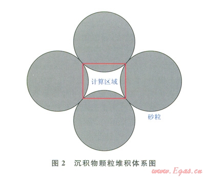由于沉積物孔隙內(nèi)水合物實(shí)際生成過(guò)程比較復(fù)雜,因而模型對(duì)物理過(guò)程進(jìn)行了簡(jiǎn)化,假定所有沉積物顆粒都為正網(wǎng)形且粒徑分布均一,沉積物體系內(nèi)各向同性。自然界中,沉積物層位于海底,由于海水和沉積層的壓力,沉積物顆粒被壓實(shí),孔隙水充填于沉積物孔隙內(nèi)部,氣體溶解于填充的孔隙水中。沉積物顆粒間彼此錯(cuò)落排列,形成沉積物間孔隙的是顆粒的圓弧面,計(jì)算區(qū)域的邊界為沉積物顆粒的弦長(zhǎng),如圖2所示。邊界條件采用反彈邊界。
