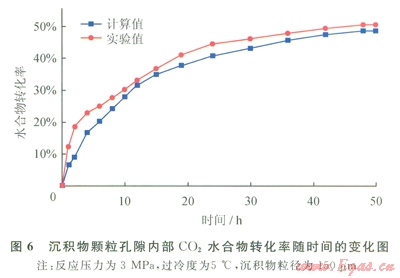 為了驗(yàn)證模擬結(jié)果的可靠性,將模擬結(jié)果與實(shí)驗(yàn)結(jié)果進(jìn)行對(duì)比,如圖5、6所示。實(shí)驗(yàn)得到的甲烷水合物和二氧化碳水合物的轉(zhuǎn)化率均大于模擬結(jié)果。這主要由以下幾個(gè)因素造成。