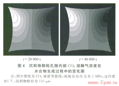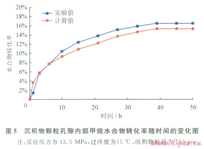 首先,實(shí)驗(yàn)采用的沉積物并非是孔徑為150mm的均一顆粒,而是介于l50~250mm的區(qū)間,因此,形成的顆粒間的孔隙尺寸也就不統(tǒng)一,孔隙尺寸分布呈一定區(qū)間,對(duì)孔隙空間內(nèi)水合物生成過(guò)程的影響也就不盡相同,而模型模擬的是沉積物粒徑為l50mm的孔隙空間,孔隙尺寸是恒定的。其次,實(shí)際實(shí)驗(yàn)過(guò)程中,氣體與沉積物體系的交界面處最容易生成水合物,同時(shí),界面處的水合物容易通過(guò)毛細(xì)作用將沉積物體系內(nèi)孔隙水運(yùn)移到水合物周圍,而水合物生成區(qū)域的擴(kuò)散傳遞作用是最強(qiáng)烈的。氣體的擴(kuò)散時(shí)刻都在發(fā)生,可能直接擴(kuò)散進(jìn)入沉積物孔隙水里,也可能直接擴(kuò)散進(jìn)入水合物中,生成水合物,而模型的假設(shè)是氣體必須首先擴(kuò)散進(jìn)入沉積物孔隙水中,再?gòu)目紫端型ㄟ^(guò)水合物膜表面擴(kuò)散生成水合物。因此,綜合考慮,模擬結(jié)果與實(shí)驗(yàn)結(jié)果存在一定的偏差,但誤差比較小,誤差范圍為3%~7%,模型結(jié)果基本可靠。