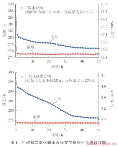 在進(jìn)行數(shù)值模擬之前,對(duì)甲烷和二氧化碳?xì)怏w水合物的生成過(guò)程先進(jìn)行了實(shí)驗(yàn)室模擬,實(shí)驗(yàn)?zāi)M裝置主要由管路、氣瓶、增壓裝置、真空泵、恒溫水浴和反應(yīng)釜組成,具體見(jiàn)本文參考文獻(xiàn)[12]。沉積物樣品選用南海淺表層沉積物,人工進(jìn)行清洗并干燥,后進(jìn)行篩分,按照一定的粒徑進(jìn)行分類。本次實(shí)驗(yàn)粒徑分布介于60~100目的沉積物,測(cè)得其孔隙度為36.7%。甲烷水合物和二氧化碳水合物生成過(guò)程分別在不同的溫度和壓力條件下進(jìn)行,觀測(cè)水合物生成過(guò)程中體系內(nèi)溫度和壓力的變化。實(shí)驗(yàn)結(jié)果如圖1所示。