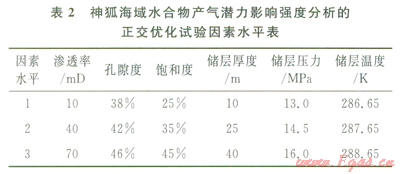 水合物藏產(chǎn)氣潛力的地質(zhì)評價參數(shù)是指對水合物產(chǎn)氣效率產(chǎn)生影響的沉積地質(zhì)要素,地質(zhì)評價參數(shù)的正確選擇是產(chǎn)氣潛力評價的關(guān)鍵。首先,通過綜合特定海域水合物區(qū)的地質(zhì)、地球物理、鉆探數(shù)據(jù)等資料,研究巖性、巖相展布規(guī)律、水合物的賦存狀態(tài)和地質(zhì)條件、水合物產(chǎn)m特征和儲層類型,定性和定量分析影響水合物分解和產(chǎn)氣潛力的各項要素,如巖性、溫壓條件、沉積體孔隙度、水合物飽和度、滲透率、儲層厚度、孔隙水鹽度等;然后,數(shù)值分析地質(zhì)參數(shù)對水合物產(chǎn)能的影響強度和敏感性,利用正交優(yōu)化試驗方法對地質(zhì)參數(shù)的影響強度進行排序,如表l中南海北部神狐海域3個站位上的水合物產(chǎn)出特征的地質(zhì)參數(shù),可構(gòu)建如表2所示的正交優(yōu)化試驗因素水平表,通過選用合適的正交表即可實現(xiàn)對地質(zhì)參數(shù)的優(yōu)化和排序;選擇對水合物藏產(chǎn)氣潛力影響較為顯著的地質(zhì)參數(shù),舍棄影響較小、敏感性差的地質(zhì)參數(shù)。