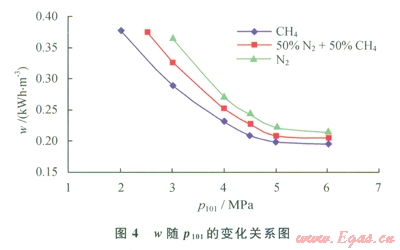 當(dāng)LNG儲存壓力(P104)為2MPa、氣體制冷劑膨脹前壓力(P204)為5MPa、氣體制冷劑膨脹前預(yù)冷溫度(t206)為-30℃時,在一定范圍內(nèi)改變進(jìn)口天然氣壓力(P101),通過HYSYS軟件模擬計算可得到產(chǎn)品LNG的單位能耗(w),進(jìn)而得到w隨P101的變化關(guān)系(圖4)。由南圖4可知,產(chǎn)品LNG單位能耗隨進(jìn)口天然氣壓力的增加而降低。這是因為壓力越高,換熱器的平均換熱溫差越小,因而能耗越低。由于進(jìn)口天然氣壓力的升高對承壓設(shè)備的要求也增加,故而不宜太高。因此,取P101為5MPa作為最優(yōu)進(jìn)口壓力。