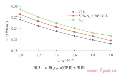 當(dāng)進(jìn)口天然氣壓力(P101)為5MPa、氣體制冷劑膨脹前壓力(P204)為5MPa、氣體制冷劑膨脹前預(yù)冷溫度(t206)為-30℃時,在一定范圍內(nèi)改變LNG儲存壓力(P104),通過HYSYS軟件模擬計算可得到產(chǎn)品LNG的單位能耗(w),進(jìn)而得到叫隨P104的變化關(guān)系(圖5)。由圖5可知,產(chǎn)品LNG單位能耗隨LNG儲存壓力的增加而降低,這是因為儲存壓力越高,對應(yīng)的液化溫度越高,所需的制冷量越少,因而能耗越低。然而儲存壓力的升高對儲存和輸運容器的耐壓要求也增高,增加了運輸成本[10]。取P104為2MPa作為最優(yōu)的LNG儲存壓力。